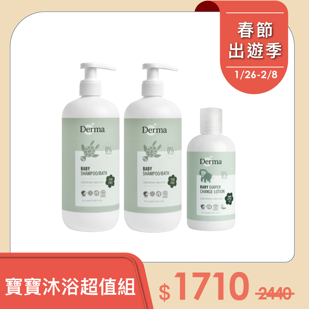【Derma丹麥德瑪】寶寶沐浴超值組-沐浴露500ml*2+乾洗屁屁*1
