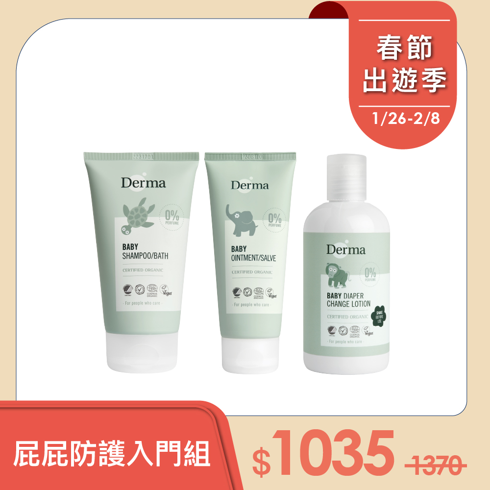 【Derma丹麥德瑪】屁屁防護入門組-沐浴露150ml+萬用膏+乾洗屁屁