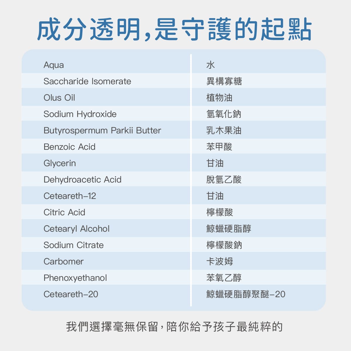 專為成長期肌膚打造,100%無香、10大不添加的單純成分。以保濕植萃「乳木果油×NMF仿生保濕因子」深層滋潤肌膚、舒緩乾癢。提升肌膚防護力。好吸收不黏膩,全身及臉部皆可使用。